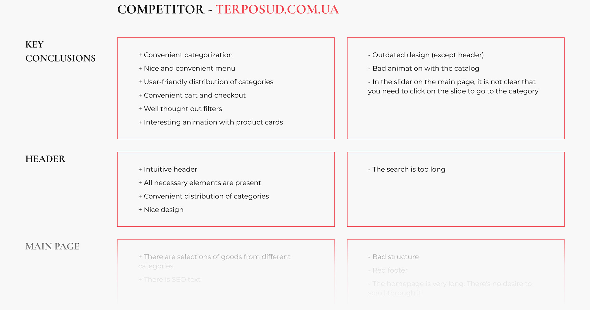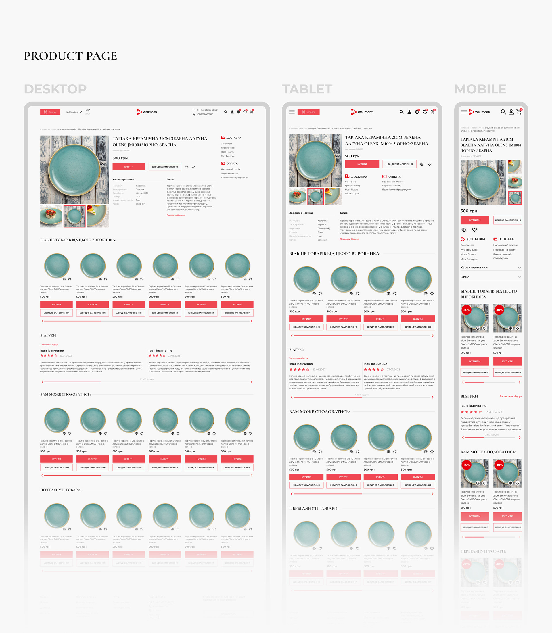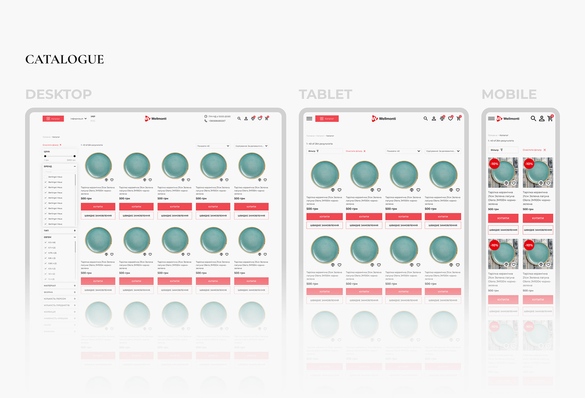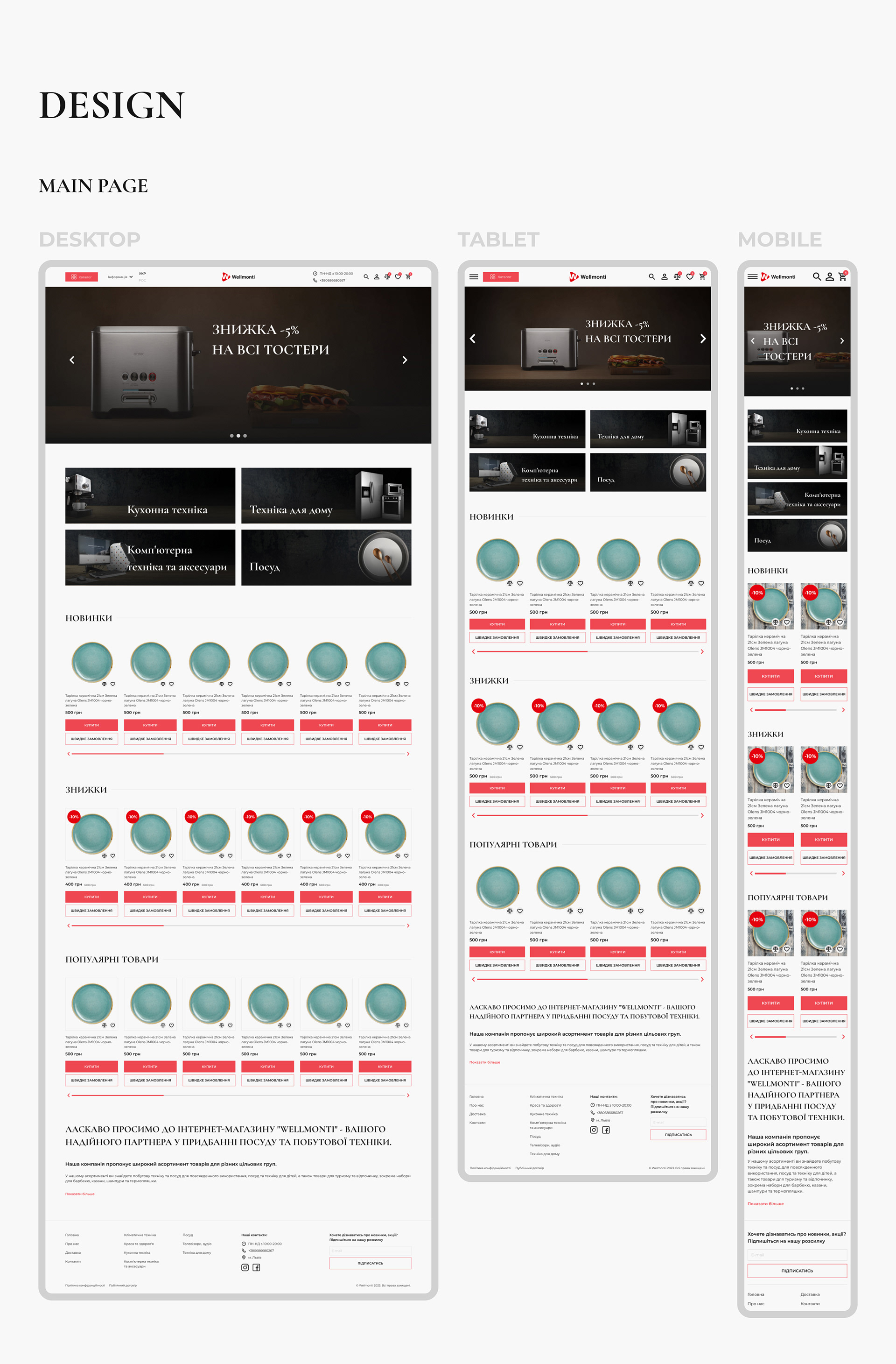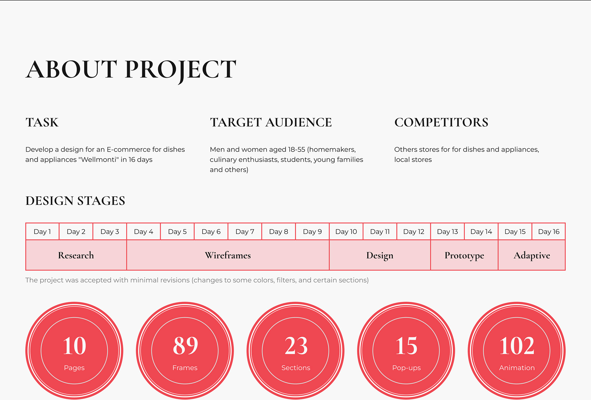 In just 16 days, we designed an e-commerce site for kitchenware and appliances. We analyzed the market, crafted the structure, wrote the copy, and developed wireframes. Once the client approved, we created the design and a clickable prototype, letting us test the site before development and make improvements. We then adapted it for tablet and mobile versions. In total, we designed 13 pages. The project was accepted with minimal tweaks (color changes, filter adjustments, and some minor details).